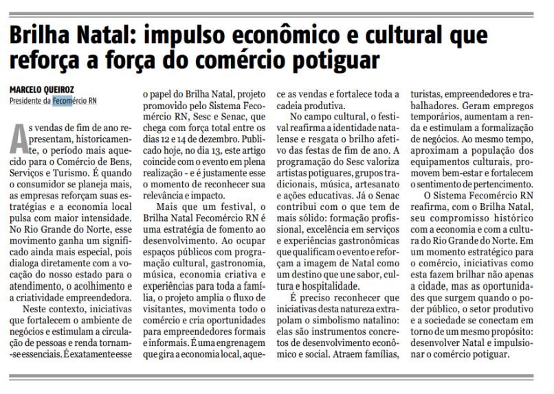Neste contexto, iniciativas que fortalecem o ambiente de negócios e estimulam a circulação de pessoas e renda tornam-se essenciais. É exatamente esse o papel do Brilha Natal, projeto promovido pelo Sistema Fecomércio RN, Sesc e Senac, que chega com força total entre os dias 12 e 14 de dezembro. Publicado hoje, no dia 13, este artigo coincide com o evento em plena realização – e é justamente esse o momento de reconhecer sua relevância e impacto.