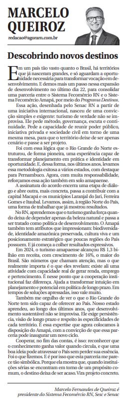 Em um país tão vasto quanto o Brasil, há territórios que já nasceram grandes, e só aguardam a oportunidade necessária para transformar vocação em desenvolvimento. E demos mais um passo nessa expansão de desenvolvimento no último dia 22, para consolidar uma parceria entre o Sistema Fecomércio RN e o Sistema Fecomércio Amapá, por meio do Programa Destinos.