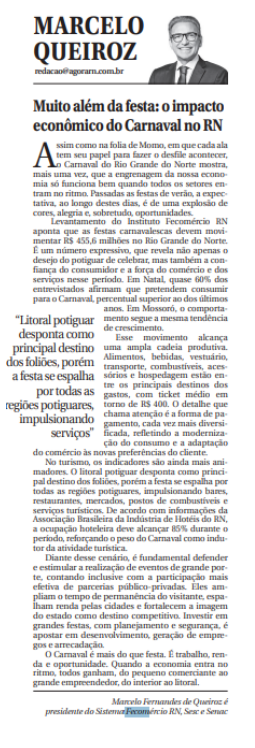Assim como na folia de Momo, em que cada ala tem seu papel para fazer o desfile acontecer, o Carnaval do Rio Grande do Norte mostra, mais uma vez, que a engrenagem da nossa economia só funciona bem quando todos os setores entram no ritmo. Passadas as festas de verão, a expectativa, ao longo destes dias, é de uma explosão de cores, alegria e, sobretudo, oportunidades.