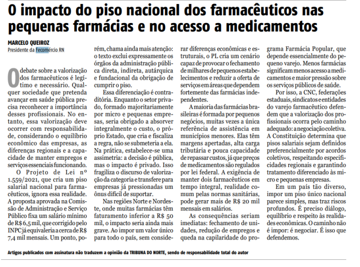 Em um país tão diverso quanto o nosso, um piso único nacional pode parecer uma solução simples. Mas, na prática, seria um problema de grandes proporções. É preciso cautela, bom senso e respeito às realidades econômicas de cada região. O Rio Grande do Norte, assim como todo o país, não pode correr o risco de perder capilaridade no atendimento farmacêutico, especialmente onde ele é mais necessário.