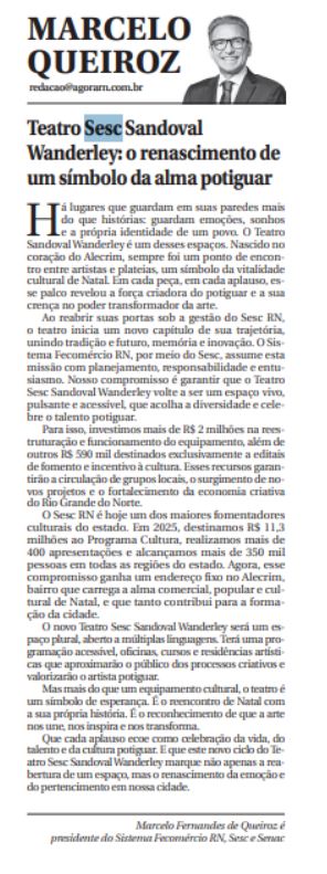 Que cada aplauso ecoe como celebração da vida, do talento e da cultura potiguar. E que este novo ciclo do Teatro Sesc Sandoval Wanderley marque não apenas a reabertura de um espaço, mas o renascimento da emoção e do pertencimento em nossa cidade.