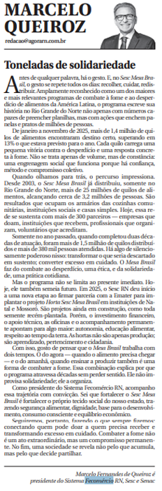 Como presidente do Sistema Fecomércio RN, acompanho essa trajetória com convicção. Sei que fortalecer o Sesc Mesa Brasil é fortalecer o próprio tecido social do nosso estado, trazendo segurança alimentar, dignidade, base para o desenvolvimento, consumo consciente e equilíbrio econômico.