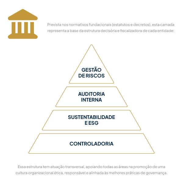 Prevista nos normativos fundacionais (estatutos e decretos), esta camada representa a base da estrutura decisória e fiscalizadora de cada entidade:
