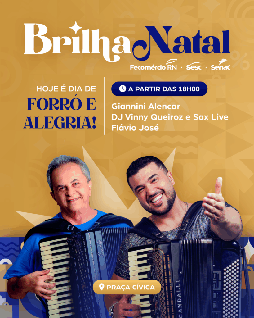 O Brilha Natal Fecomércio RN 2025 abre seu Festival Cultural e Gastronômico nesta sexta-feira (12), com shows de Flávio José e Gianinni Alencar, na Praça Cívica. As apresentações, que são gratuitas, terão início a partir das 18h, marcando um dos momentos mais esperados da iniciativa do Sistema Fecomércio RN, que chega à sua terceira edição movimentando comércio, cultura e serviços nos bairros do Alecrim e Cidade Alta.