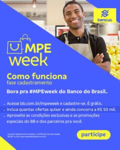 Para participar, as empresas têm até o dia 17 de outubro para cadastrarem as promoções para os seus clientes no site bb.com.br/mpeweek; em contrapartida, o banco oferece benefícios na contratação de produtos e serviços para os clientes MPE, como capital de giro com taxas reduzidas na contratação, desconto na tarifa de liquidação e registro de cobranças, dentre outras. Entre os dias 18 a 31 de outubro, as ofertas ficam disponíveis no site para os consumos para os mais de 20 milhões de clientes. O material será divulgado nos canais de comunicação do Banco do Brasil e nas redes sociais.